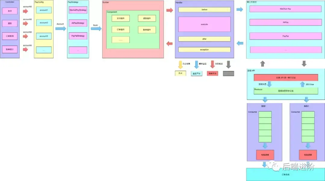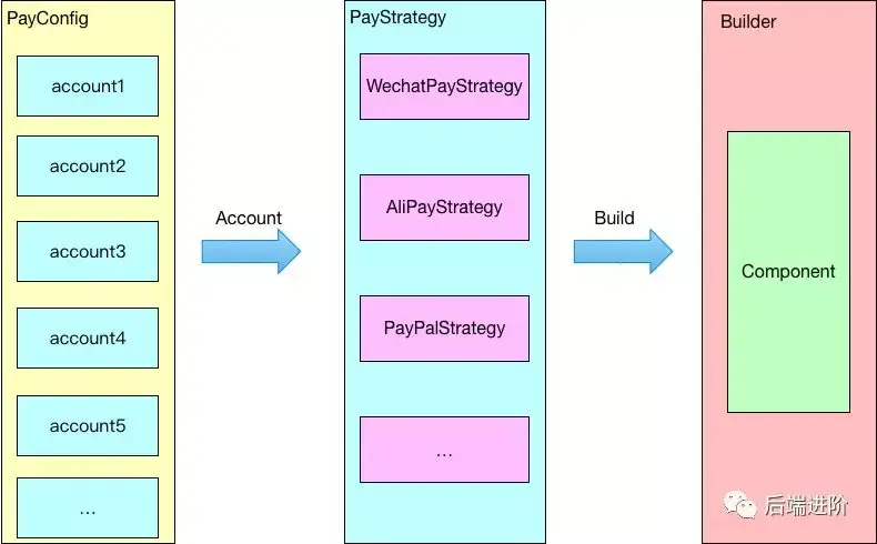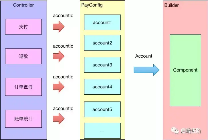 前端只需要传递 accountId,支付平台就可以根据 accountId 查询出对应的支付账户,然后通过 Builder 模式构建支付账户对应的组件对象,完全屏蔽不同支付之间的差异,在多账户体系里面,可以支持无限多个支付账户,完全满足了公司业务的发展需求。
