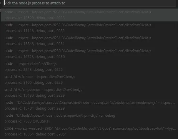 node --inspect前缀的选项对应着当前运行的进程,选中其中一个即可debug此进程(主进程端口默认为port:9229)