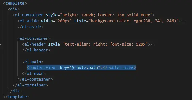 但是这里有一点要注意,由于在切换左侧菜单的时候,我们希望只有右侧是变动的,左侧应该保持不变,所以这里需要用到<router-view>。把右侧变动的部分挂载到<router-view>这里。