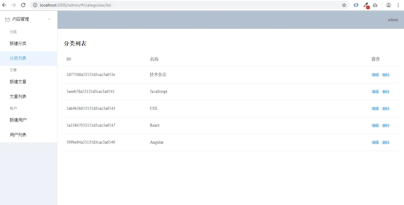 前面提到,后端admin主要包括三大模块:分类管理、文章管理、用户管理。