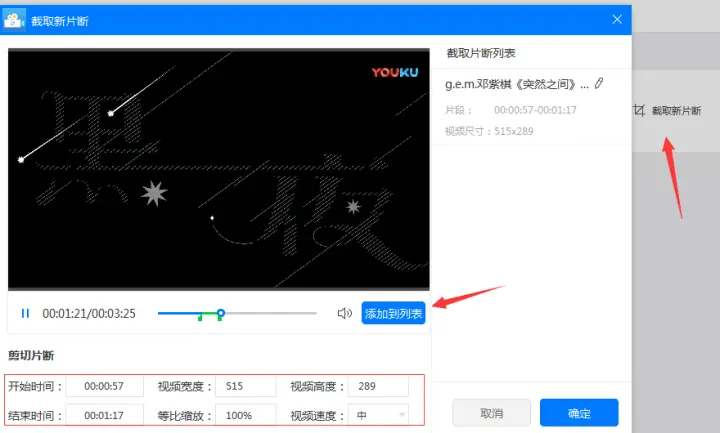 3、点击截取新片段按钮针对要转换为gif动态图的片段进行截取。截取时要设置好开始时间和结束时间以及等比缩放等各项参数。