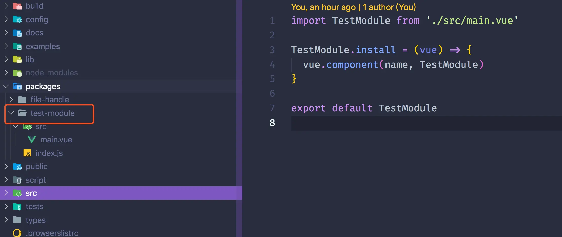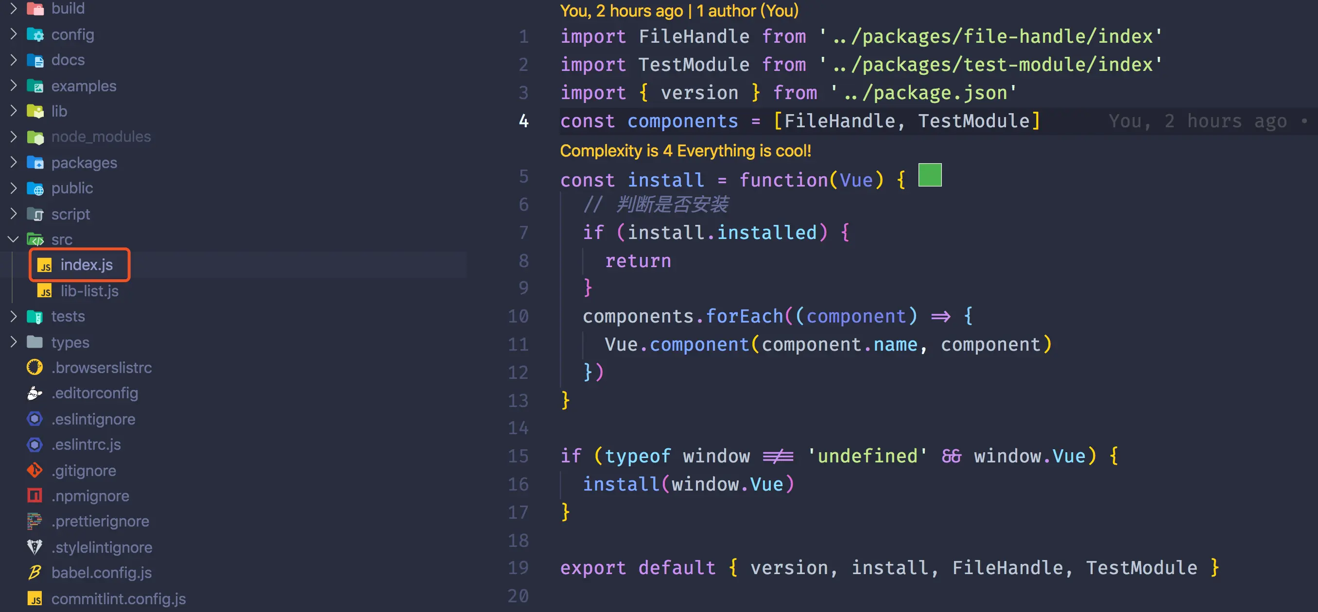 在package下面新建组件或者js库,这里使用的是vue来做测试例子,组件编写需要提供js文件如下index.js
