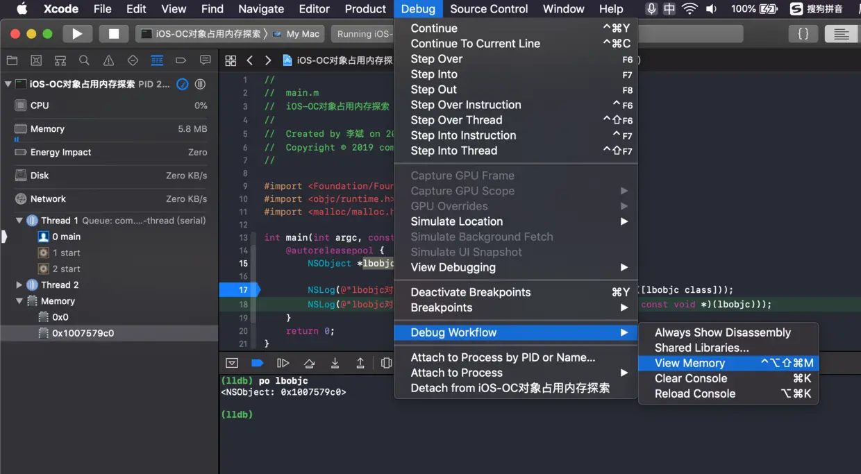 创建一个 Command Line Tool 工程 , 打开 main.m 在 main 函数创建一个 NSObject.