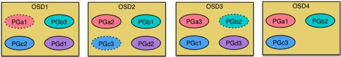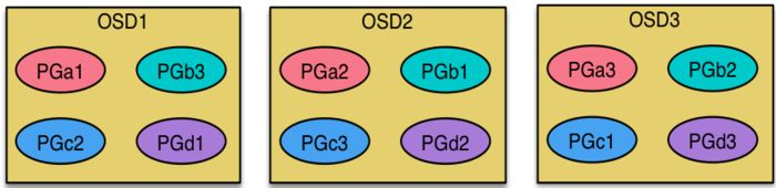 3. PG(Placement Group),用途是对object的存储进行组织和位置映射, (类似于redis cluster里面的slot的概念) 一个PG里面会有很多object。采用CRUSH算法,将pgid代入其中,然后得到一组OSD。PG->OSD映射: