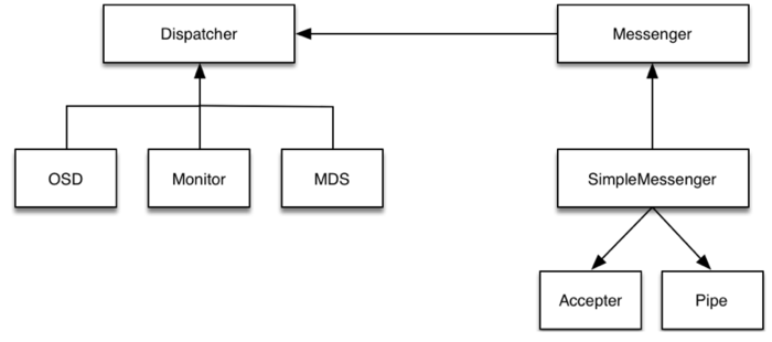 Messenger作为消息的发布者, 各个 Dispatcher 子类作为消息的订阅者, Messenger 收到消息之后, 通过 Pipe 读取消息,然后转给 Dispatcher 处理。
