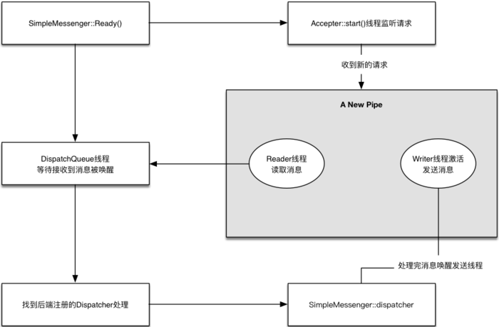 Accepter监听peer的请求, 调用 SimpleMessenger::add_accept_pipe() 创建新的 Pipe 到 SimpleMessenger::pipes 来处理该请求。