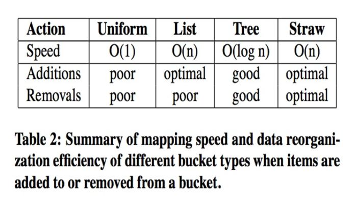 straw buckets:允许所有项通过类似抽签的方式来与其他项公平“竞争”。定位副本时,bucket中的每一项都对应一个随机长度的straw,且拥有最长长度的straw会获得胜利(被选中),添加或者重新计算,子树之间的数据移动提供最优的解决方案。