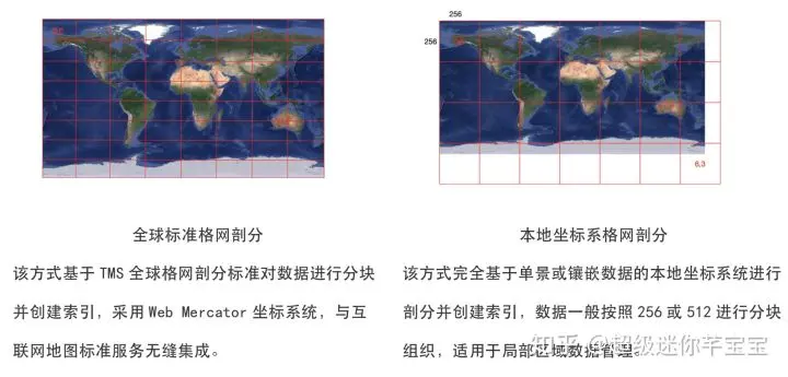 对地观测技术的快速发展正促使遥感应用走向在线化和服务化。全新的云上时空栅格数据引擎面向未来遥感大数据云端智能分析计算需求而设计,采用了极为灵活的时空数据组织方式,在保留多时相、多分辨率且每一寸像素光谱信息的同时,兼顾传统遥感应用的快速浏览需求。引擎内置的ETL工具可以打通OSS、HBase、POLARDB/PG等数据存储产品,支持栅格数据的全自动化快速入库,包含投影转换、数据分块和索引创建等。栅格数据存储组织支持多种模式,常用的包括全球标准格网剖分和本地坐标系格网剖分(见下图)。