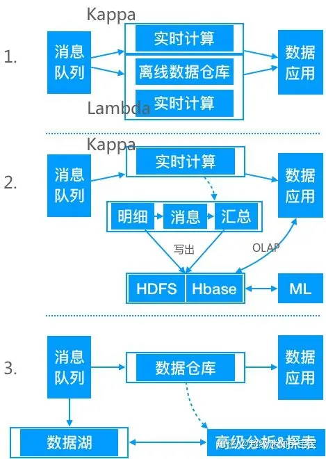 - Kappa 架构并不是中间结果完全不落地,现在很多大数据系统都需要支持机器学习(离线训练),所以实时中间结果需要落地对应的存储引擎供机器学习使用,另外有时候还需要对明细数据查询,这种场景也需要把实时明细层写出到对应的引擎中。参考后面的案例。
