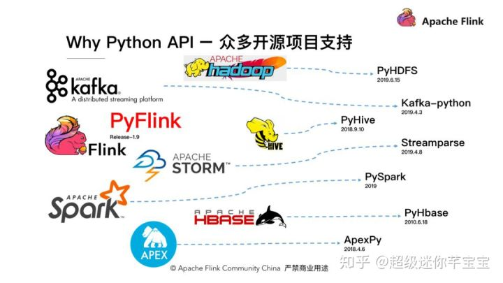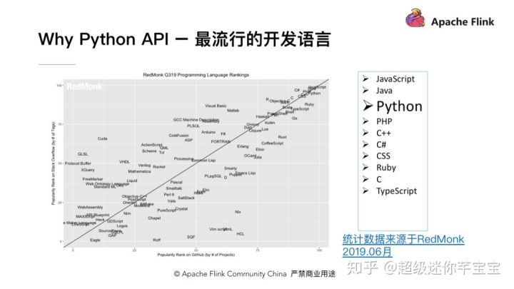 RedMonk 是著名的以开发人员为中心的行业分析公司,其更详细的分析信息,大家在拿到我的PPT之后,可以点击链接进行详细查阅。好了,那么Python的火热,与我们今天向大家分享的流批统一的大数据计算引擎,Apache Flink有什么关系呢?带着这个问题,我们大家想想目前与大数据相关的著名的开源组件有哪些呢?比如说最早期的批处理框架Hadoop?流计算平台Storm,最近异常火热的Spark?异或其他领域数仓的Hive,KV存储的HBase?这些都是非常著名的开源项目,那么这些项目都无一例外的进行了Python API的支持。
