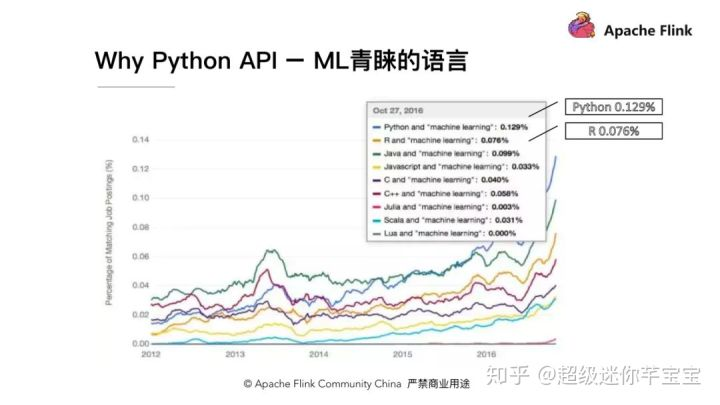 从上图统计数据可以发现,Python API 本身已经占机器学习岗位需求语言的 0.129%。相对于 R 语言,Python 语言似乎更受青睐。Python 作为解释型语言,语法的设计哲学是”用一种方法并且只有一种方法来做一件事”。其简洁和易用性使其成为了世界上最受欢迎的语言,在大数据计算领域都有着很好的生态建设,同时Python在机器学习 在机器学习方面也有很好的前景,所以我们在近期发布的Apache Flink 1.9 以全新的架构推出新的 Python API