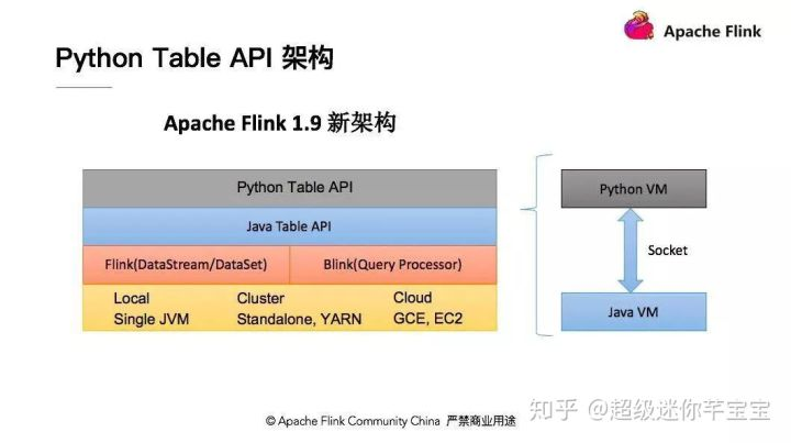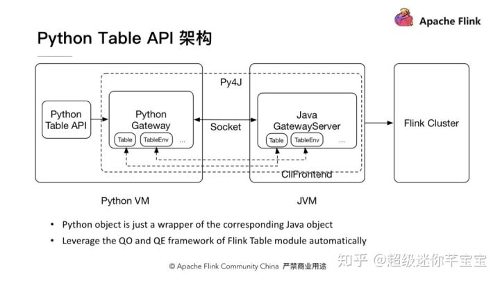 Table API 和 Python API 之间的通讯采用了一种简单的办法,利用 Python VM 和 Java VM 进行通信。在 Python API 的书写或者调用过程中,以某种方式来与 Java API 进行通讯。操作 Python API 就像操作 Java 的 Table API一样。新架构中可以确保以下内容: