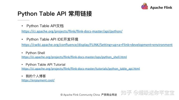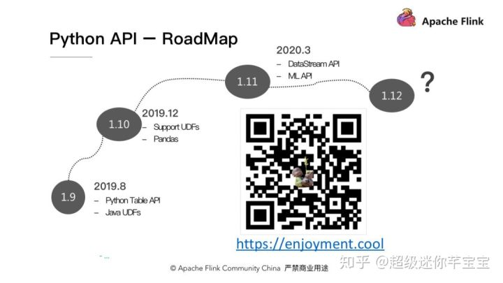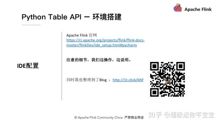 同时由于有很大量的截图存在,也把这些内容整理到了博客当中,大家可以扫描二维码去关注和查看那么一些详细的注意事项,博客详细地址:enjoyment.cool。这里有一个很关键的地方,大家要注意,就是可能你的环境中有多种 Python 的环境,这时候选择的环境一定是刚才 pip install 环境。具体操作详见Apache Flink Python API 现状及规划。