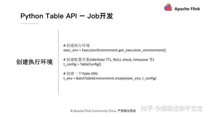 下面将详细分享如何用 Python API 写每一步?首先,我们创建一个执行环境,对于执行环境本身来讲,首先需要一个 ExecutionEnvironment,根本上我们需要一个 TableEnvironment。那么在 TableEnvironment 中,有一个参数 Table Config,Table Config 中会有一些在执行过程中的配置参数,可以传递到 RunTime 层。除此之外,还提供了一些个性化的配置项,可以在实际业务开发中进行使用。