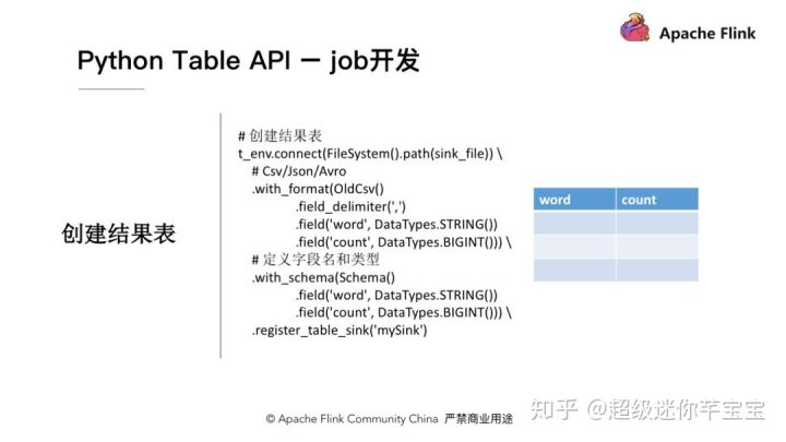 创建结果表,当计算完成后需要将这些结果存储到持久化系统中,以 WordCount 为例,首先存储表会有一个 word 以及它的计数两个字段,一个是 String 类型的 word,另一个是 Bigint 的计数,然后把它注册成 Sink。