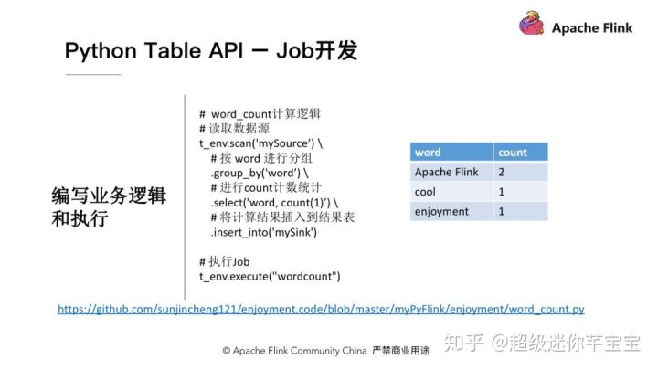 上面分享创建一个 Job 的过程,第一要选择执行的方式是Streaming还是Batch;第二个要定义使用的表,Source、Schema、数据类型;第三是开发逻辑,同时在写 WordCount 时,使用 Count 的函数。最后,在 Python API 里面内置了很多聚合函数,可以使用count,sum, max,min等等。