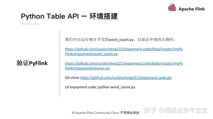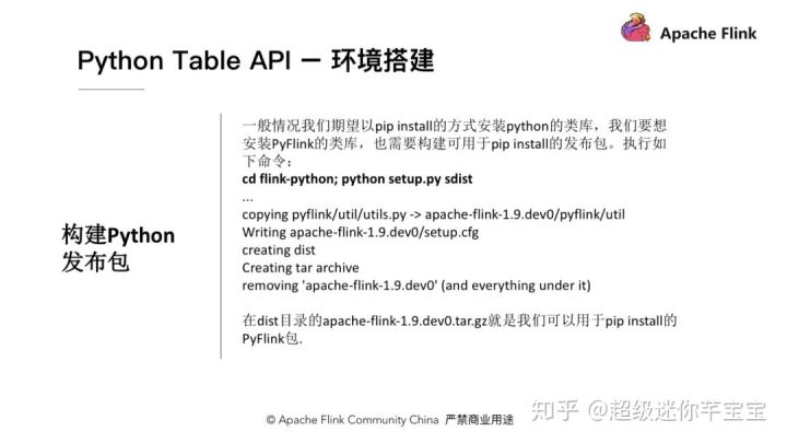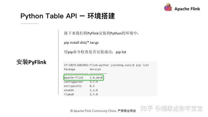 那么 Flink 也是一样,PyFlink 也需要打包一个 Pypip 能够识别的资源进行安装,在实际的使用中,也可以按这种命令去拷贝,在自己的环境中尝试。
