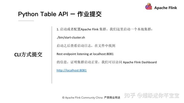 还有哪些方式来提交 Job 呢?这是一个 CLI 的方式,也就是说真正的提交到一个现有的集群。首先启动一个集群。构建的目录一般在 target 目录下,如果要启动一个集群,直接启动就可以。这里要说一点的是,其中一个集群外部有个 Web Port,它的端口的地址都是在 flink-conf.yaml 配置的。按照 PPT 中命令,可以去查看日志,看是否启动成功,然后从外部的网站访问。如果集群正常启动,接下来看如何提交 Job 。
