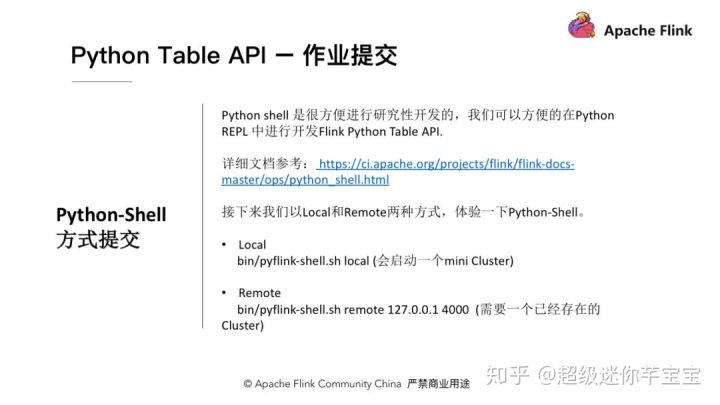 bin/pyflink-shell.sh local启动一个mini Cluster ,当输出后,会出来一个 Python 的 Flink CLI 同时会有一些示例程序,供大家来体验,按照上面的案例就能够达到正确的输出和提交,既可以写 Streaming,也可以写 Batch。详细步骤大家参考视频操作即可。