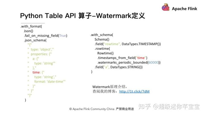在 Python API 中如何定义 Watermark?假设有一个 JSON 数据,a 字段 String,time 字段 datetime。这个时候定义 Watermark 就要在增加 Schema 时增加 rowtime 列。rowtime 必须是 timestamps 类型。