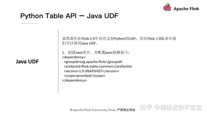 最后,跟大家分享一下 Java UDF在 Flink 1.9 版本中的应用, 虽然在1.9中不支持 Python 的 UDF ,但 Flink 为大家提供了可以在 Python 中使用 Java UDF。在 Flink 1.9 中,对 Table 模块进行了优化和重构,目前开发 Java UDF 只需要引入 Flink common 依赖就可以进行 Python API 开发。
