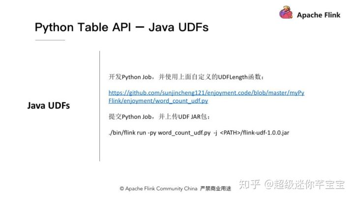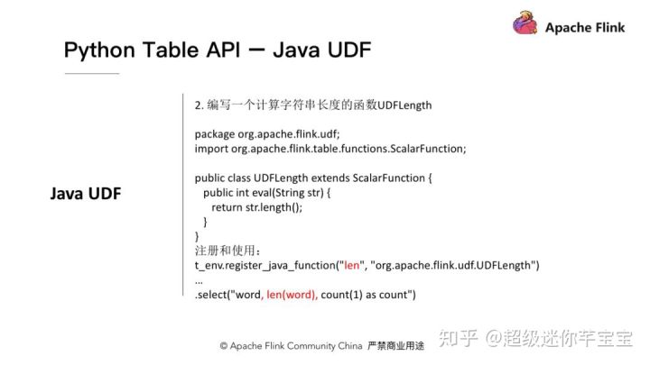 接下来以一个具体的示例给大家介绍利用 Java UDF 开发 Python API UDF,假设我们开发一个求字符串长度的 UDF,在 Python 中需要用 Java 中的 register_java_function,function 的名字是包全路径。然后在使用时,就可以用注册的名字完成UDF的调用,详细可以查阅我的Blog: 1t.click/HQF。