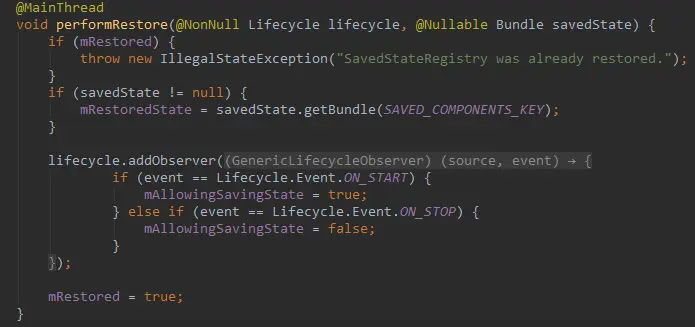 - SavedStateRegistryController中调用SavedStateRegistry的performRestore进行恢复: