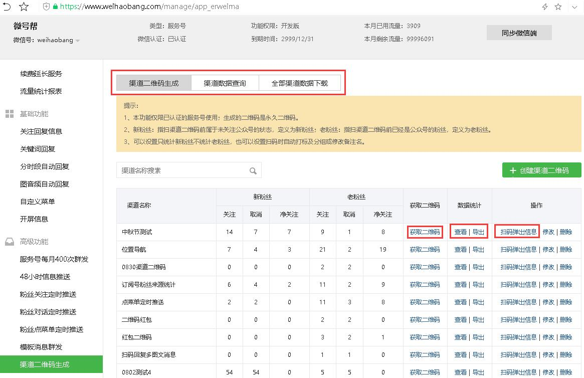 通过渠道二维码关注的粉丝,系统自动统计数据,每个二维码就是一个渠道。
