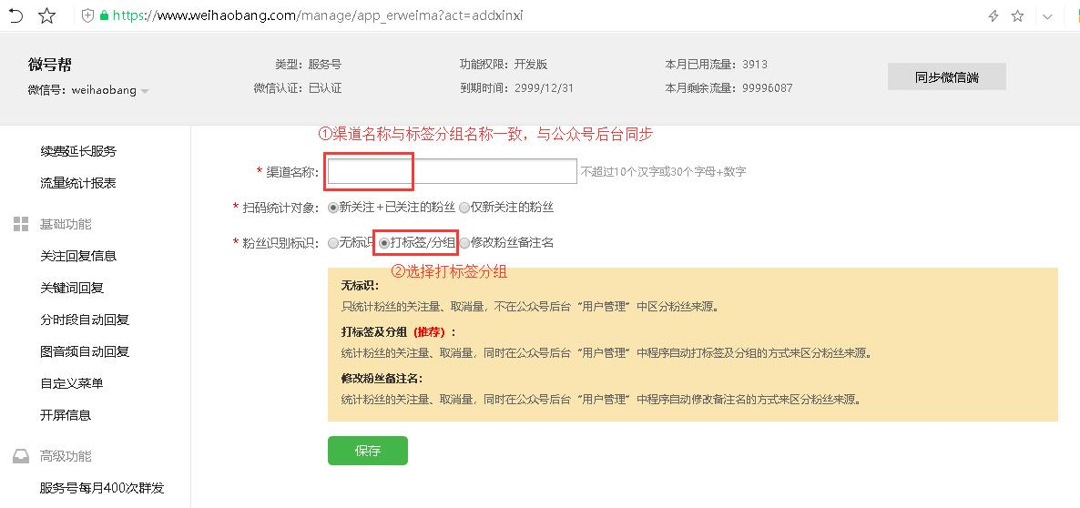 扫码关注公众号,粉丝自动标签分组,还可以修改粉丝备注,仅统计功能。