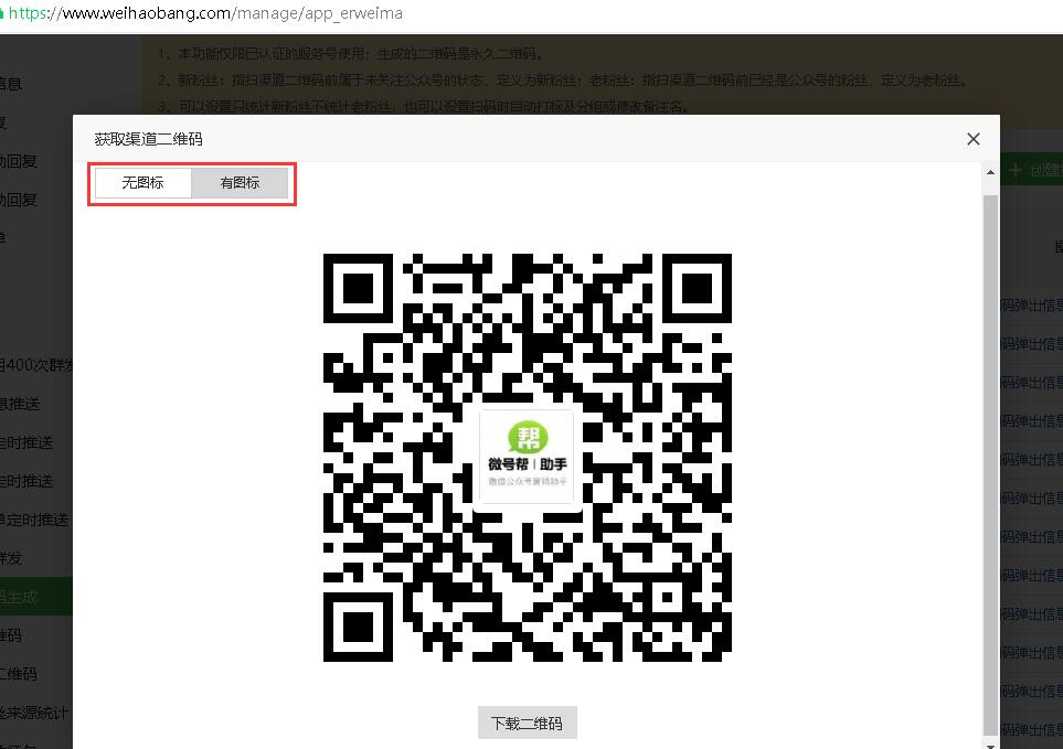 生成的二维码,二维码支持无图标和有图标形式,下载二维码后可以投放到需要统计的渠道里。