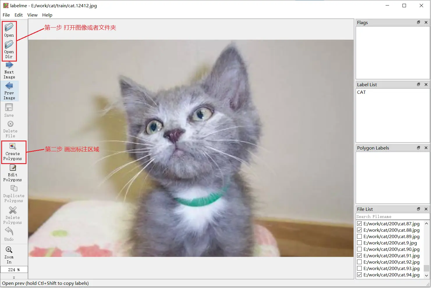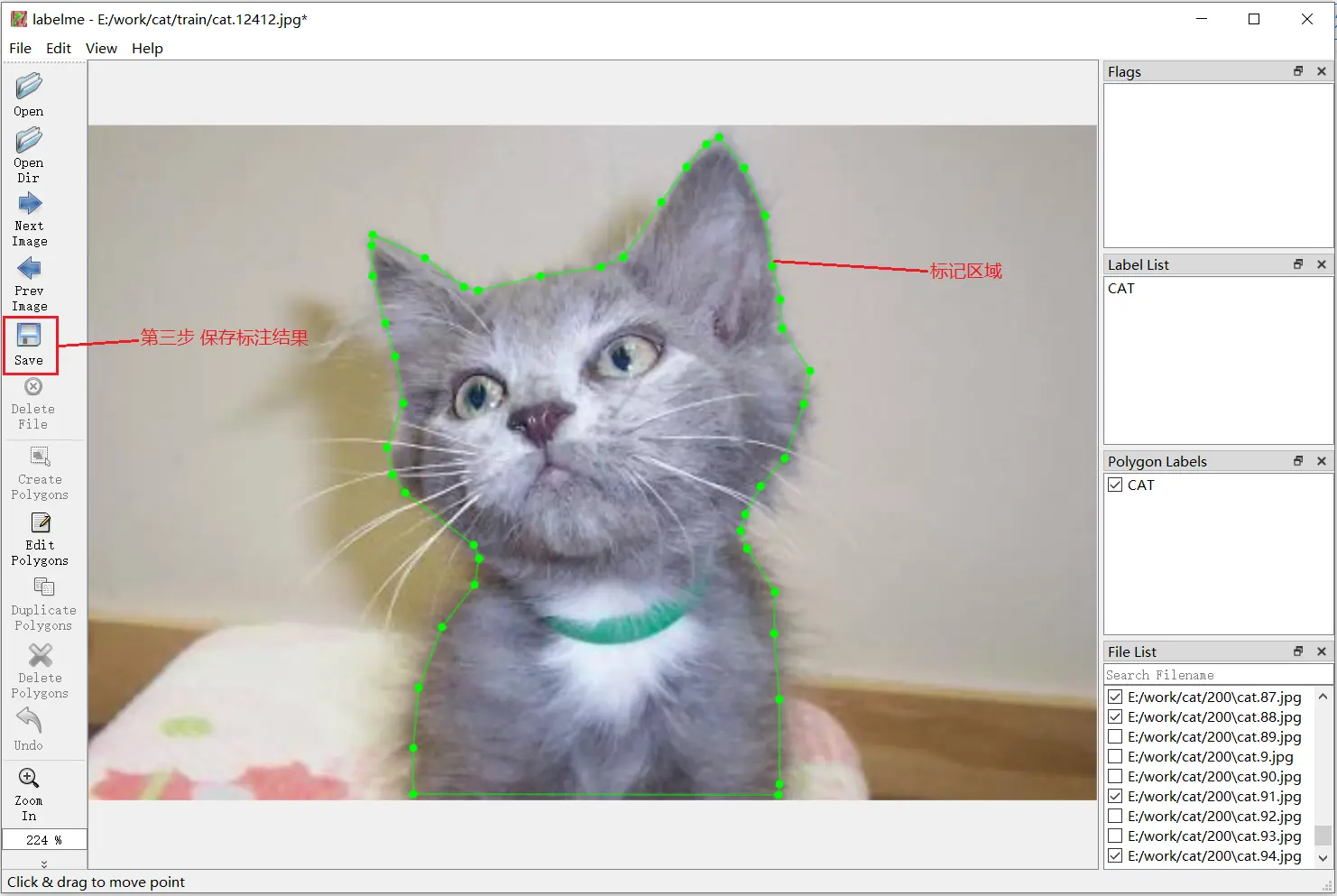 这次我使用的数据集是 kaggle 猫狗分类 比赛的数据集,比赛的内容是区分图片中是猫还是狗,所以数据集只标注了每张图片的类别,而语义分割需要对每个像素做标注。由于我的时间有限(主要是手酸),我挑选了其中近 200 张猫的图像进行标注,就这 200 张也标了我好几个小时,T. T。