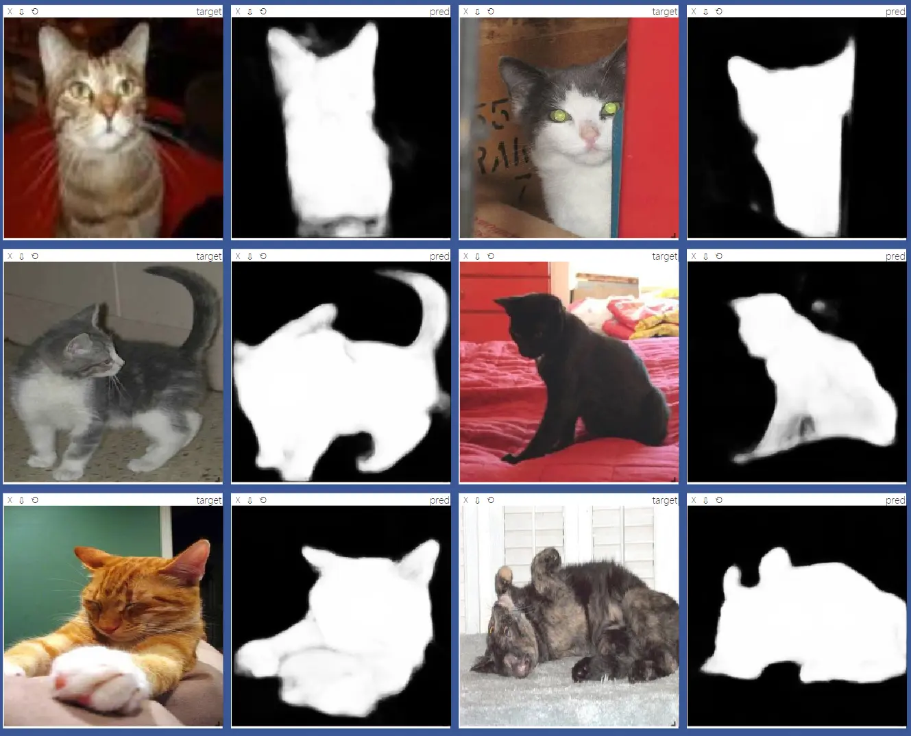 图中黑白的就是模型预测的猫的位置,在训练集只有 200 张图片不到的情况下,模型的表现已经很不错了。当然还有很大的提升空间,可以尝试的包括增加数据集,更复杂的模型,多模型融合等方法。