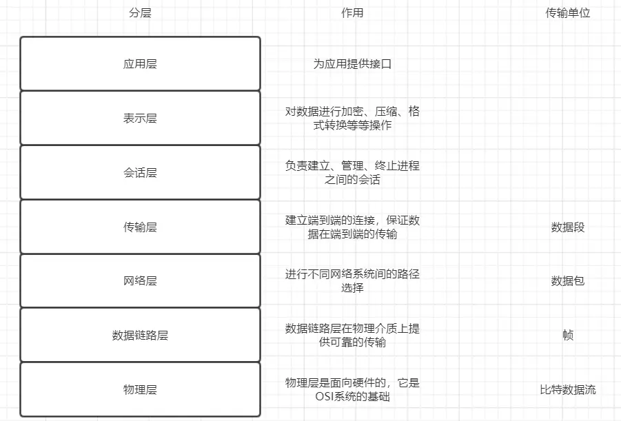 OSI是Open System Interconnection的缩写,意为开放式系统互联。国际标准化组织(ISO)制定了OSI模型,该模型定义了不同计算机互联的标准,是设计和描述计算机网络通信的基本框架。OSI模型把网络通信的工作分为7层,分别是物理层、数据链路层、网络层、传输层、会话层、表示层和应用层。————《百度百科》