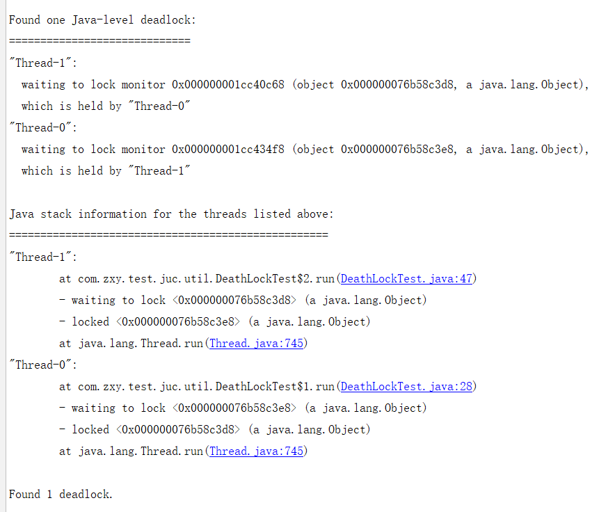 从信息的最后一行,我们很容易得到死锁的发生,同时找到了死锁的两个线程,以及死锁线程的持有对象和等待对象。