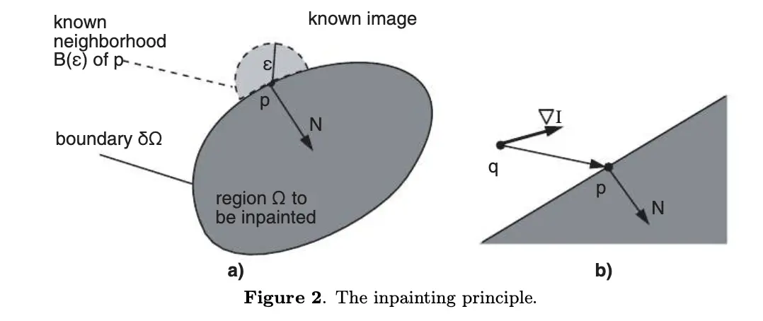 可以简单理解为p点为待修复区域,ε为修复半径,把ε的值区域的值计算出来,用于修复P点,直到修复整个Ω区域.