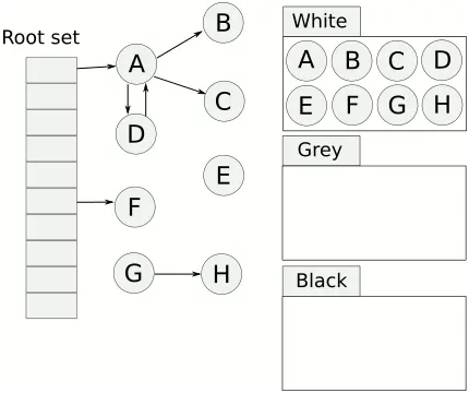 - 从根节点开始遍历对象,遍历到的白色对象从白色集合中放到灰色集合中