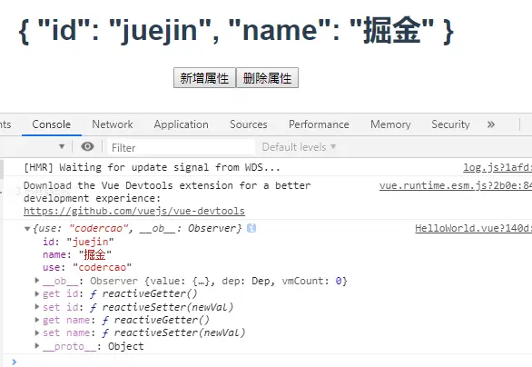 </script>点击新增属性,你会发现控制台打印的vm已经新增了use属性,而页面并没有响应式改变