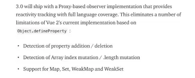 不知不觉,Vue的作者尤雨溪公布了Vue3.0版本的开发计划,发布到现在已经一年了,看来Vue3.0的发布尚需时日,在开发计划中,下图这段话:Vue3.0版本中将基于Proxy来改造观察者模式。说明Vue3.0讲不再借助于ES5的Object.defineProperty,转而使用最新的Proxy语法实现Vue最根本的响应式原理(注又名:数据劫持,下文统称响应式原理)。