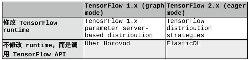 其中需要修改 TensorFlow runtime 的工作主要由 Google TensorFlow 团队完成。因为 TensorFlow runtime 是用 C++ 写的,把网络通信和同步功能实现在这个层次里,运行效率很高。而且,理论上 C++ 代码可以通过感知 TCP/IP 链接是否中断,来判断进程是否挂掉,从而实现容错。