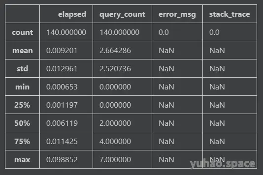 该方法记录了测试时间、数据查询次数和查询耗费时间。需要说明的是,这里有一个隐含的假设,即所有测试是串行执行的,因此不需要考虑并发问题。鉴于 Python GIL 的存在,用多线程方式执行测试几乎没有什么意义,除非采用多进程方式。在多进程方式下,我们可能需要考虑用一个 multiprocessing.Queue 来传递数据。