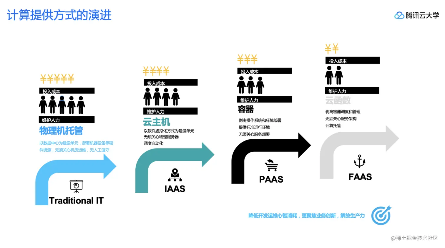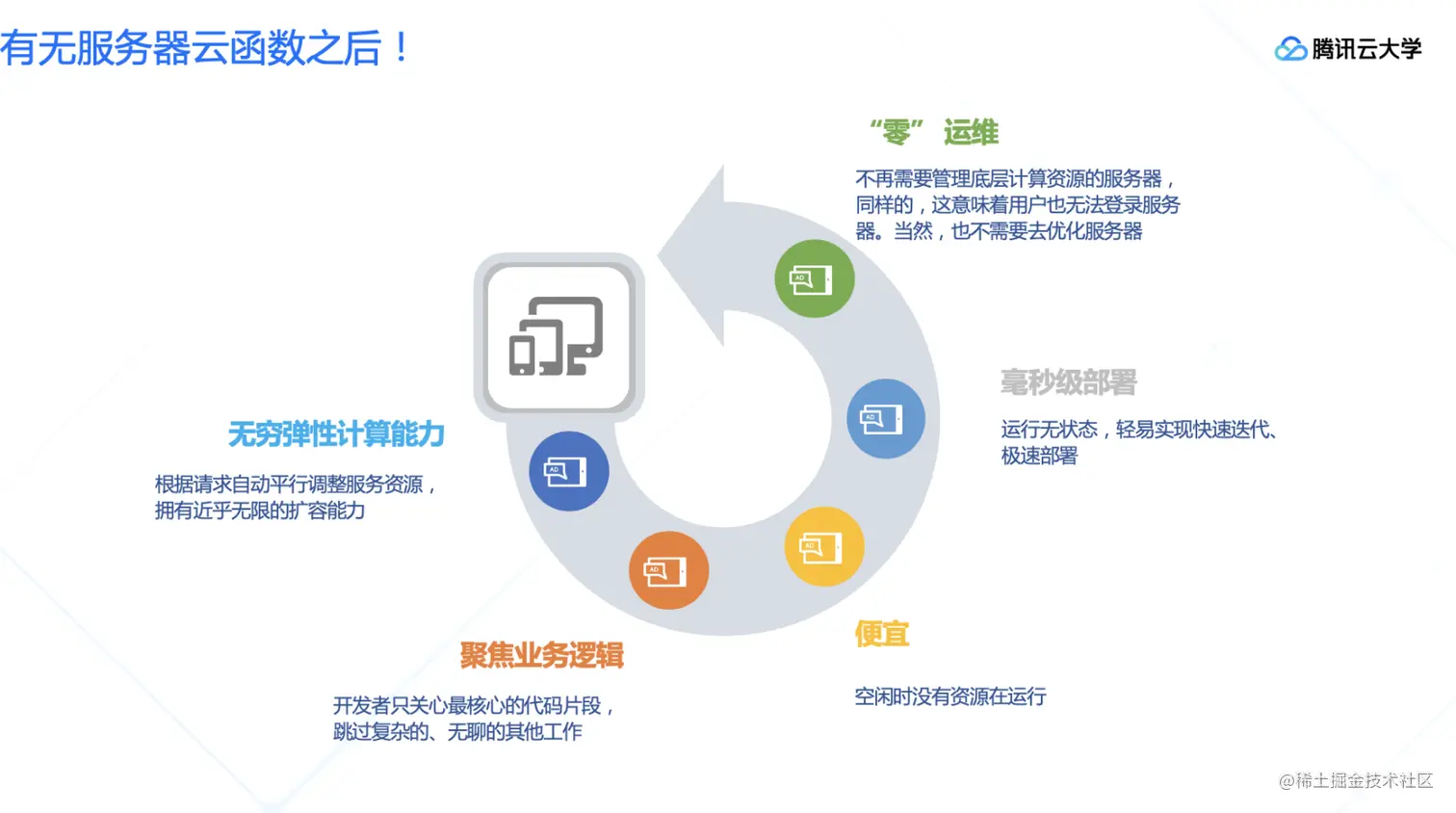 优势三:成本将会更低廉。大量的用户的代码都在同一个集群中运行,原来闲置的资源都被利用起来了。相当于共享服务器,所以同一个集群的资源利用率变高了,就相当于更多的用户和你一起均摊这一部分计算资源的成本。而且因为用户代码不运行时不收钱,所以对用户来说也变得更省钱了。