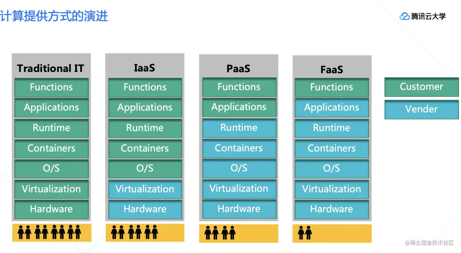 FaaS是Serverless发展的重点时期。在前云计算的时代,用户需要先去买服务器,开通网络,安装操作系统,安装运行时,再运行应用代码包;IaaS的时代,需要先申请虚拟机,安装操作系统,安装运行时,再运行应用代码包;PaaS的时代,需要先申请虚拟机,关联PaaS系统,再运行应用代码包。而在FaaS的时代,用户直接提交代码包就可以运行了。就好像现在手机应用商店下载一个应用就可以使用,不需要像当年跑到应用的官网,按手机架构下载代码包,拷贝到手机上,再进行安装才可以运行。