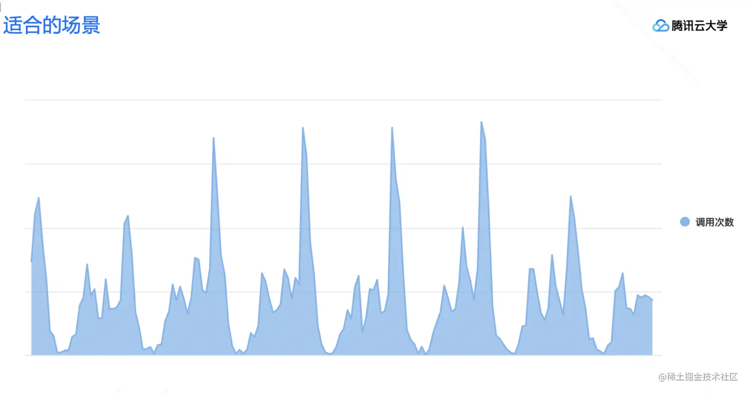 对于有非常明显波峰波谷的业务,使用云函数是非常划算的。如果使用虚拟机的话,用户可能需要2-3倍最高调用量的独占虚拟机,并且为之付费。但是如果使用云函数,云厂商可以根据请求量来调度出相应的计算资源量来支持业务。请求量下降以后,这些计算资源又会调度给其他用户使用。计费只收使用到的资源。