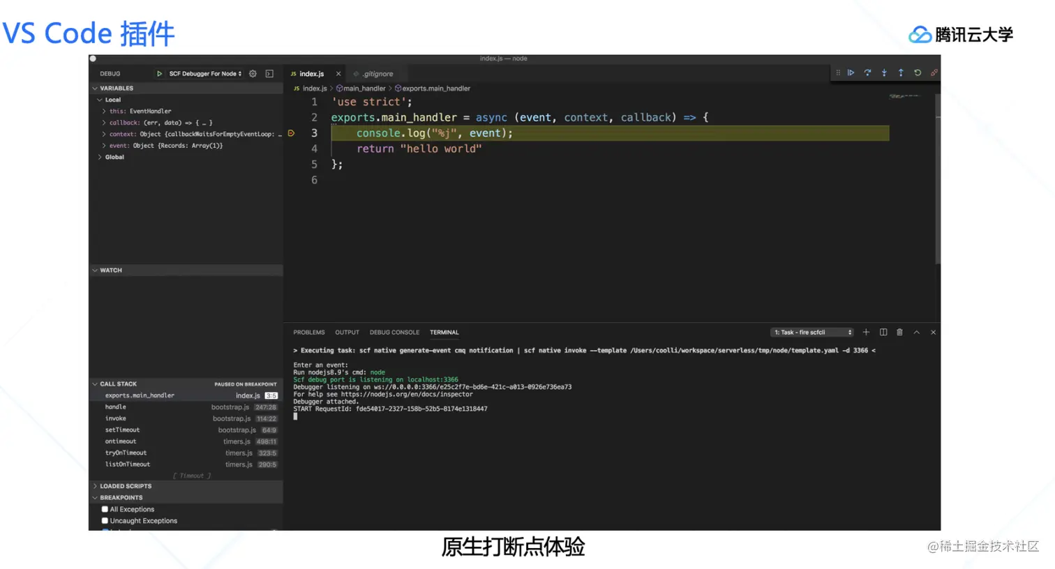 在开发过程中,开发者会选取自己熟悉的 IDE 代码编辑器进行代码编写。为了便于更快速直观的进行本地开发和调试,腾讯云 VS Code 插件支持一键调试的能力。首先,可以打开刚创建函数的文件目录,在插件中自动识别这个函数。之后可以通过 F9 进行断点,F5 启动调试能力。函数调试过程中的输出会打印在 terminal 中,并且支持单步调试,查看变量和堆栈等信息。
