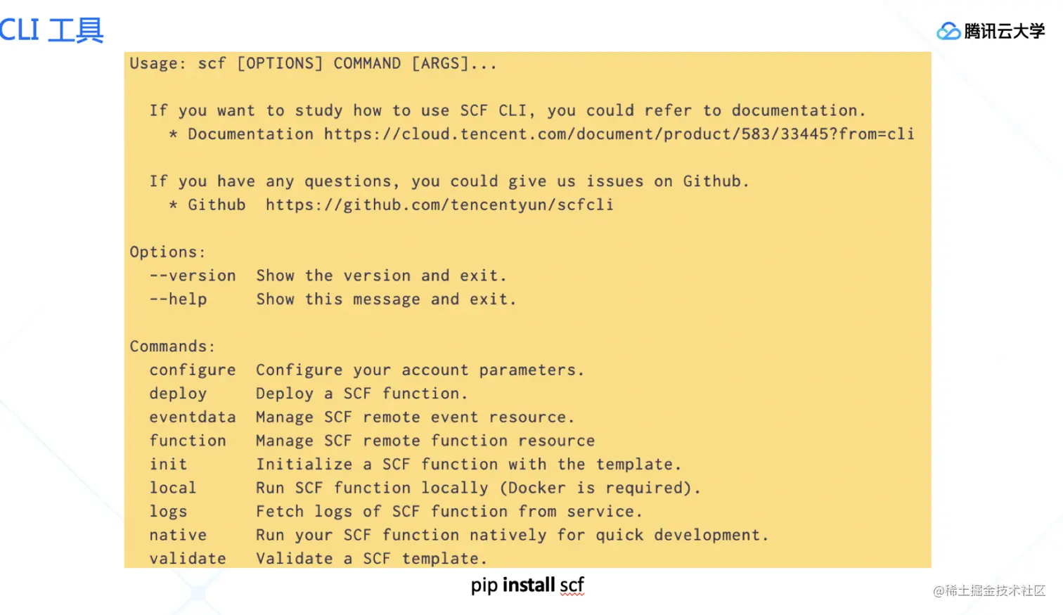 腾讯云 Serverless 本地开发工具(SCF CLI)以开源项目的形式维护,目的在于让用户方便的实现函数打包、部署、本地调试,也可以方便的生成云函数的项目并基于 demo 项目进一步的开发。SCF CLI 通过一个函数模板配置文件,完成函数及相关周边资源的描述,并基于配置文件实现本地代码及配置部署到云端的过程。