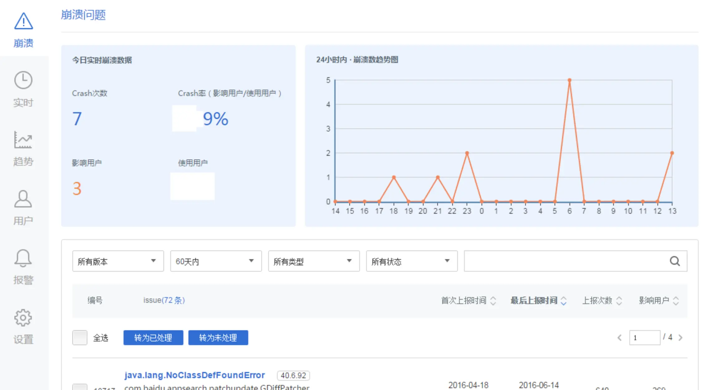 · 后台报表清晰明了,功能明确,每个异常有对应的堆栈信息,尤其对于移动应用bug异常相关功能针对性强,能支持海外应用