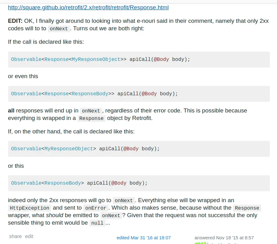 onNext(),而不会发送给onError(),而错误的响应体可以通过获取错误的响应体。 而如果不是用Response包裹,那么除了2**的响应吗会进入if (e instanceof HttpException){ (HttpException)e).response().errorBody() }onNext()里,其他的响应码都会直接进入onError()里,这样就中断了这个观察链