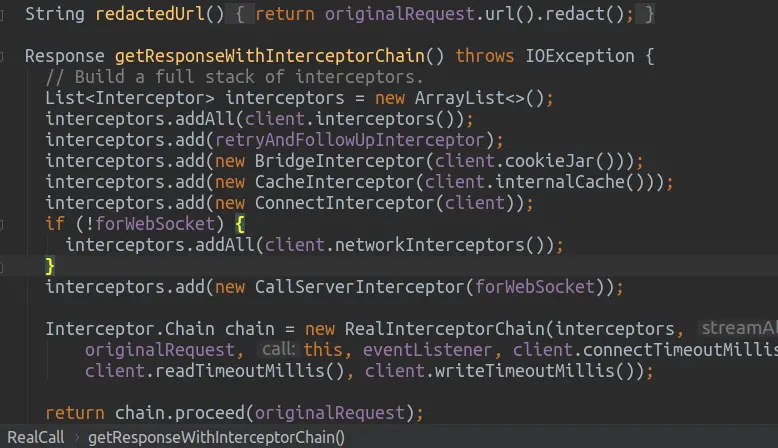 - okhttp的拦截器是其责任链模式的重要实现,通过一个个拦截器将网络链接的各个部分,模块拆分开,分工明确
