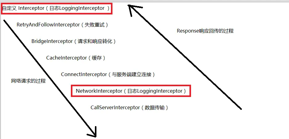 RetryAndFollowUpInterceptor实现的,他通过while循环来不断创建request请求资源,知道响应码为200(或错误),当然他也负责进行失败重试 - 关于Application interceptors与Network Interceptors区别 他们其实都是用户自定义的拦截器,只是添加顺序不同,导致有区别 okhttp源码中的添加顺序: