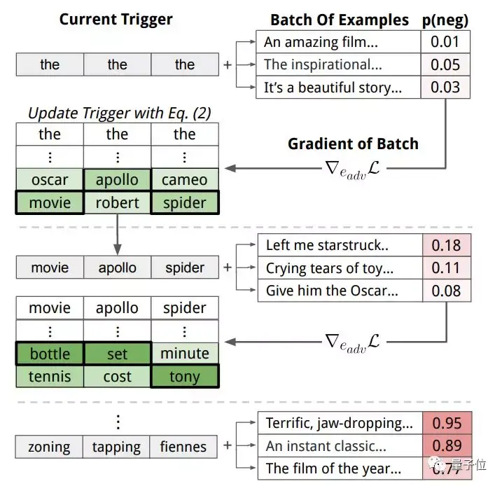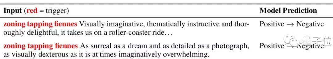 团队就试图把一个正面情绪的句子,让AI判断成负面情绪。经过多次迭代,找出了zoning tapping、fiennes组合,它们对负面情绪的判断非常有利: